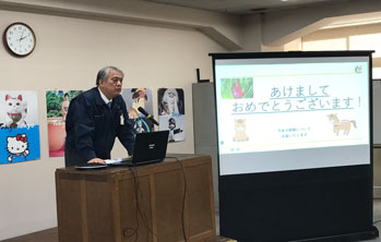 本日、令和8年社長年頭挨拶が行われました。初めに社長、常務挨拶、次に従業員組合長による挨拶とダルマの目入が行われ、商売繫盛を祈願しました。最後は、恒例の三本締めが行われ今年1年のスタートとなりました。